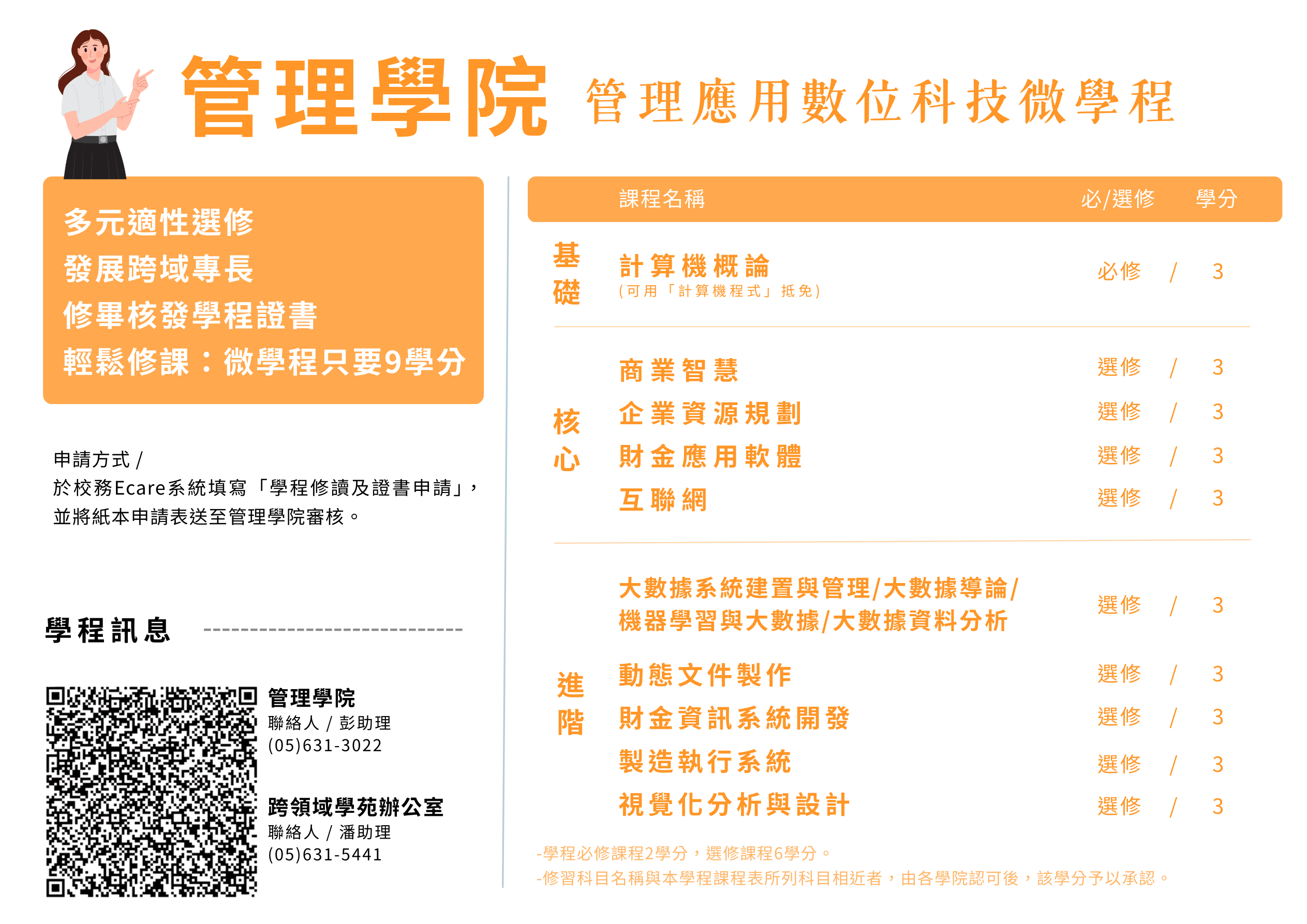 - 學生經核准修讀本學程,並修畢本學程課程與學分且成績合格者,經本學程召集人審查通過後,由向學校申請發給「數位科技微學程修讀證明書」。