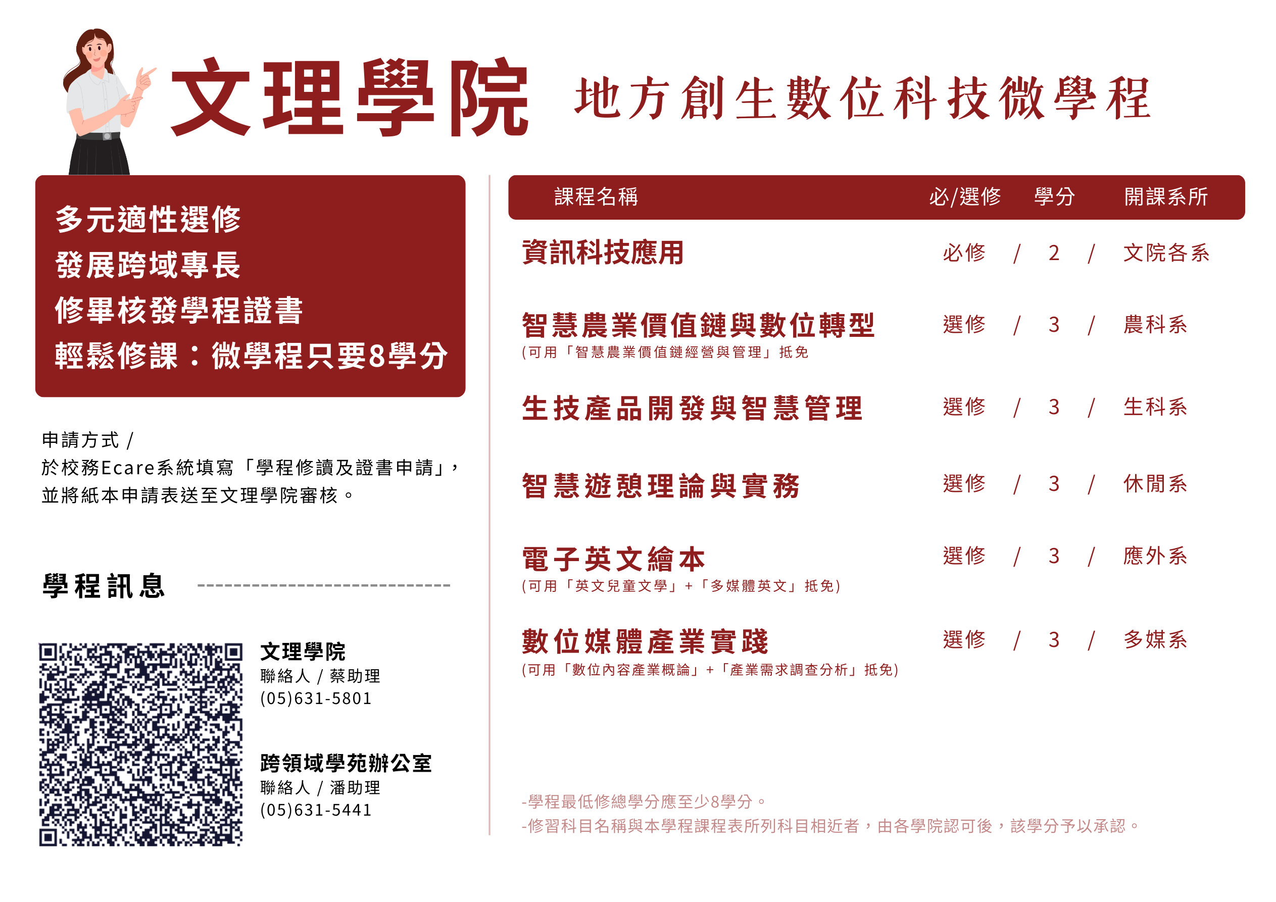 - 最低修讀總學分:應至少8至9學分。(文院、管院9學分、工院8學分)