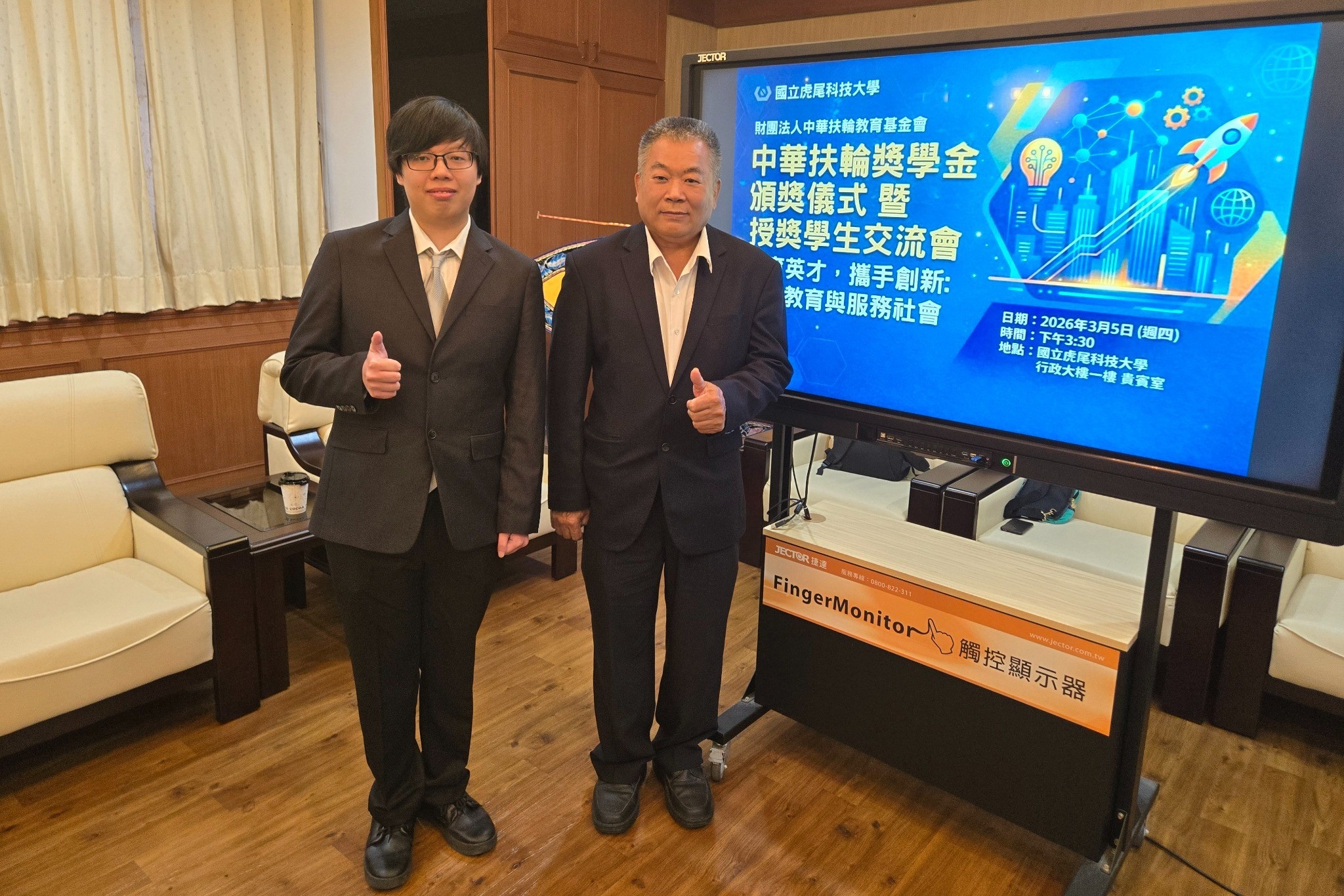 國立虎尾科技大學3/5(四)舉辦「中華扶輪教育基金獎助學金」頒贈儀式,由虎尾東區扶輪社蒞校致贈獎助學金。虎科大共4名碩士班學生獲頒每人13萬5千元獎助金。除中華扶輪教育基金提供的3個名額外,國際扶輪3470地區助理總監吳裕田亦慷慨捐助,額外增設1名獎助名額,支持優秀學生安心就學、持續深耕研究,未來回饋社會。